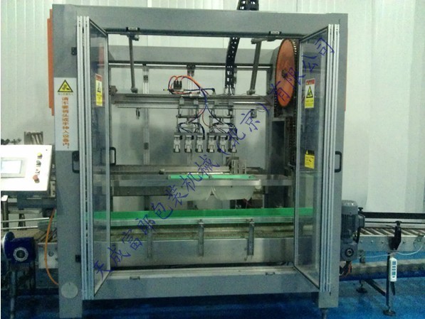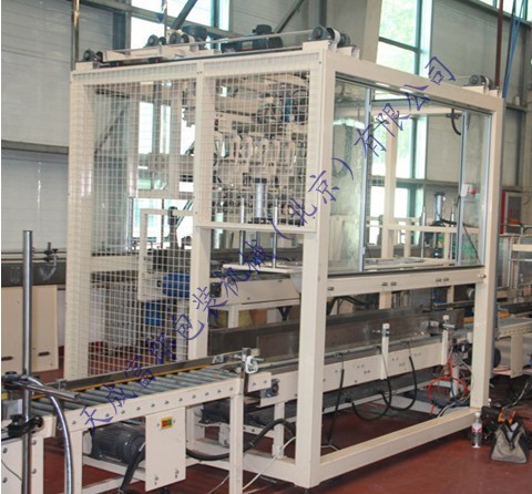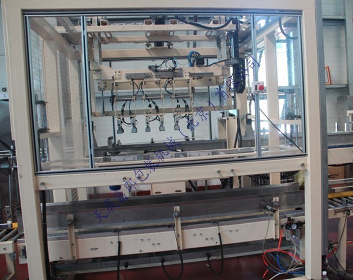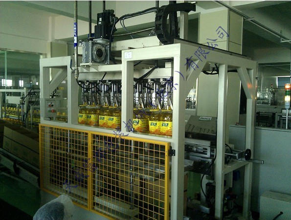 電動(dòng)裝箱機(jī)是一種智能性全自動(dòng)裝箱機(jī),采用高速分配裝置包裝各種容器,包裝塑料扁瓶、圓瓶、不規(guī)則形瓶,各種大小玻璃瓶,圓瓶、橢圓形瓶、方形罐及紙罐等,另外也適用于帶隔板的包裝箱。由瓶夾(內(nèi)置橡膠,以防損傷瓶體)夾住瓶體(每次2箱),放入打開的紙箱當(dāng)中,當(dāng)抓頭抬起時(shí),將紙箱排出,送至封箱機(jī),本機(jī)采用P.L.C + 觸摸顯示屏控制。設(shè)有缺瓶報(bào)警停機(jī),無瓶不裝箱安全裝置。本流水線大大方便操作、管理、減少生產(chǎn)人員和勞動(dòng)強(qiáng)度,是自動(dòng)化規(guī)模生產(chǎn)必不可少的設(shè)備。